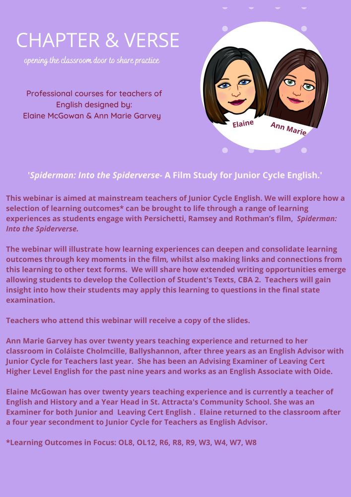 This webinar is aimed at mainstream teachers of Junior Cycle English. We will explore how a selection of learning outcomes* can be brought to life through a range of learning experiences as students engage with Persichetti, Ramsey and Rothman’s film, Spiderman: Into the Spiderverse.