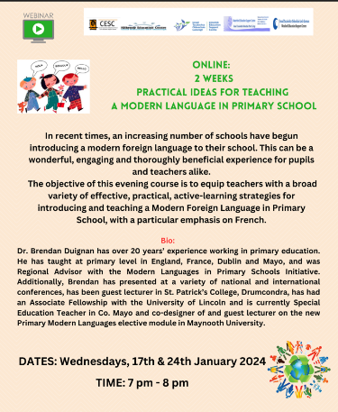 The objective of this course is to equip teachers with a broad variety of effective, practical, active-learning strategies for introducing and teaching a Modern Foreign Language in Primary School, with a particular emphasis on French.