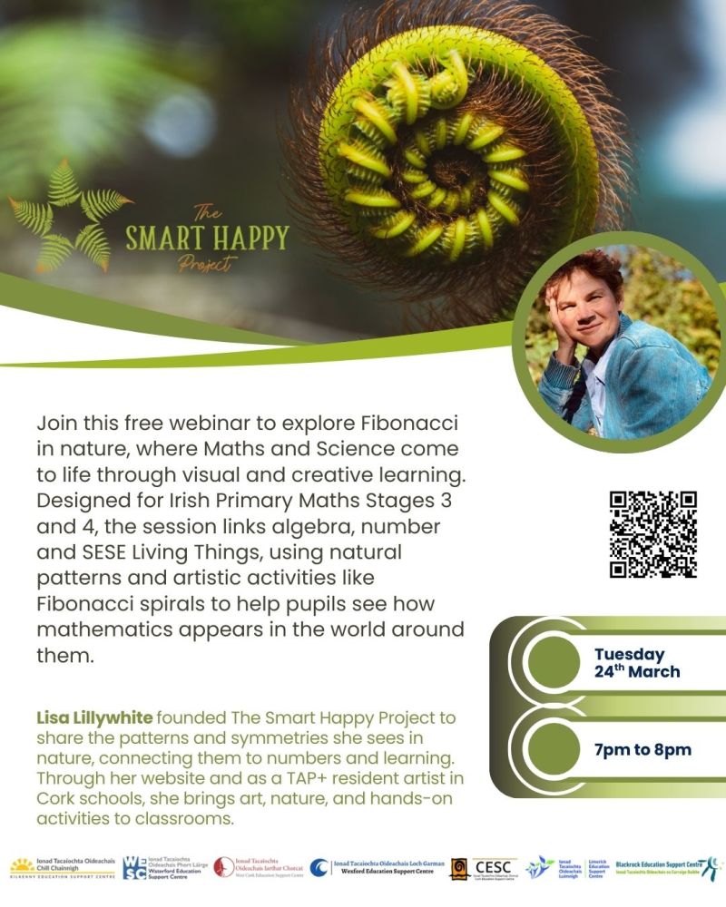 Lisa founded The Smart Happy Project to share the wonders of natural shapes and patterns. Following a design career in London, She turned her designer’s eye to see the patterns and symmetries within nature. Hedgerows and seashores became the field study of seeing geometries in nature that matched those with the numbers her children learnt in classrooms. Through thesmarthappyproject.com Lisa shares her understanding of shapes and numbers in nature. She offers activities and publications with her online following and is currently a resident artist in Cork schools through the TAP+ partnership program bringing art and nature to lively classrooms in the city.